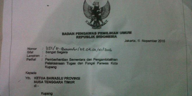 Perihal : Pemberhentian Sementara dan Pengambilalihan Pelaksanaan Tugas dan Fungsi Panwas Kota Kupang