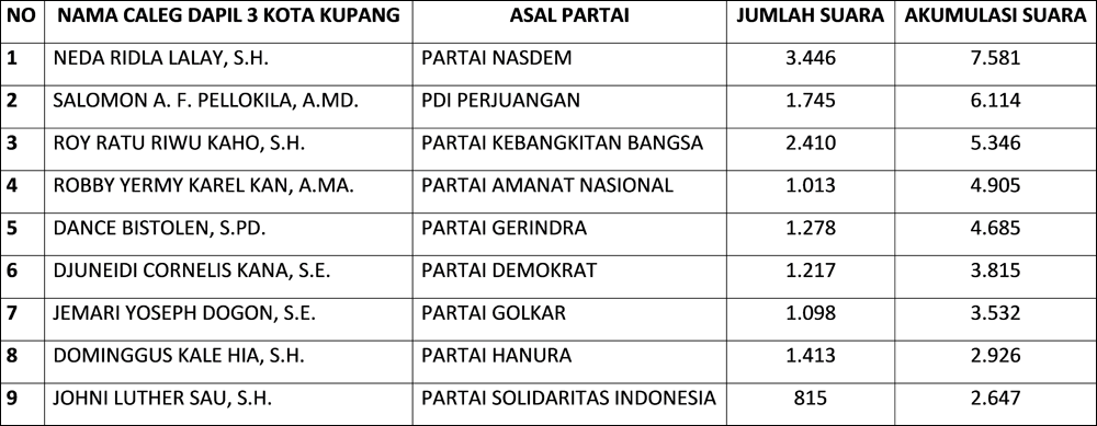 Sesuai data, terdapat 9 partai politik beserta 9 calegnya masing-masing yang berhak mendapatkan kursi dari dapil 3 Kota Kupang – kecamatan Maulafa, yakni diantaranya: