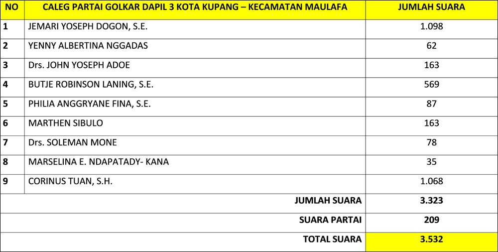 Berikut hasil perolehan suara partai dan caleg dari partai Golkar untuk dapil Kota Kupang 3 kecamatan Maulafa: