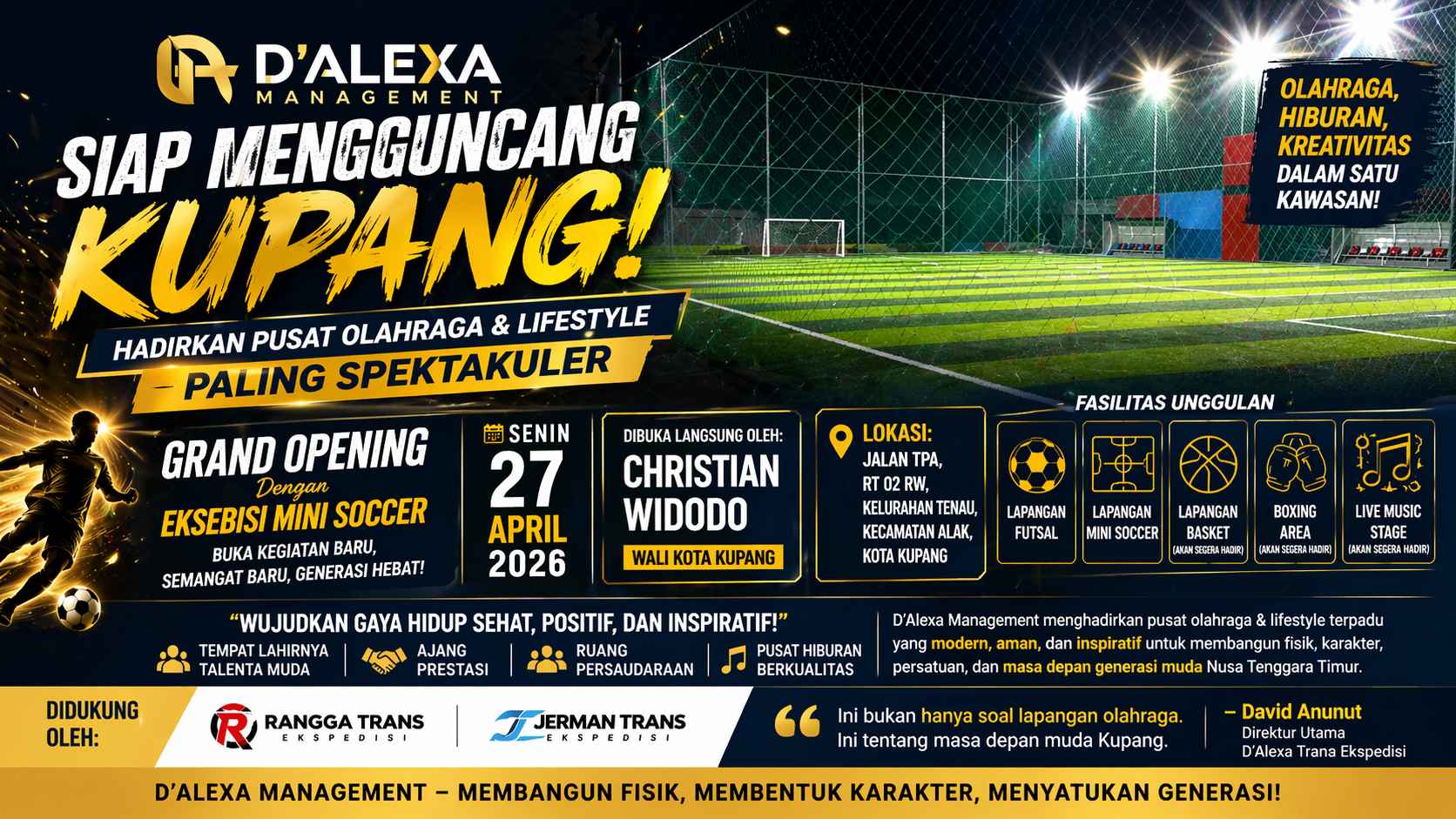 Direktur Utama D’Alexa Trans Ekspedisi, David Anunut, menyampaikan bahwa Pusat Olahraga & Lifestyle D’Alexa dibangun sebagai jawaban atas tingginya minat masyarakat terhadap olahraga dan kegiatan produktif. Menurutnya, Kupang membutuhkan ruang representatif yang mampu menyalurkan energi muda ke arah yang positif dan membangun.